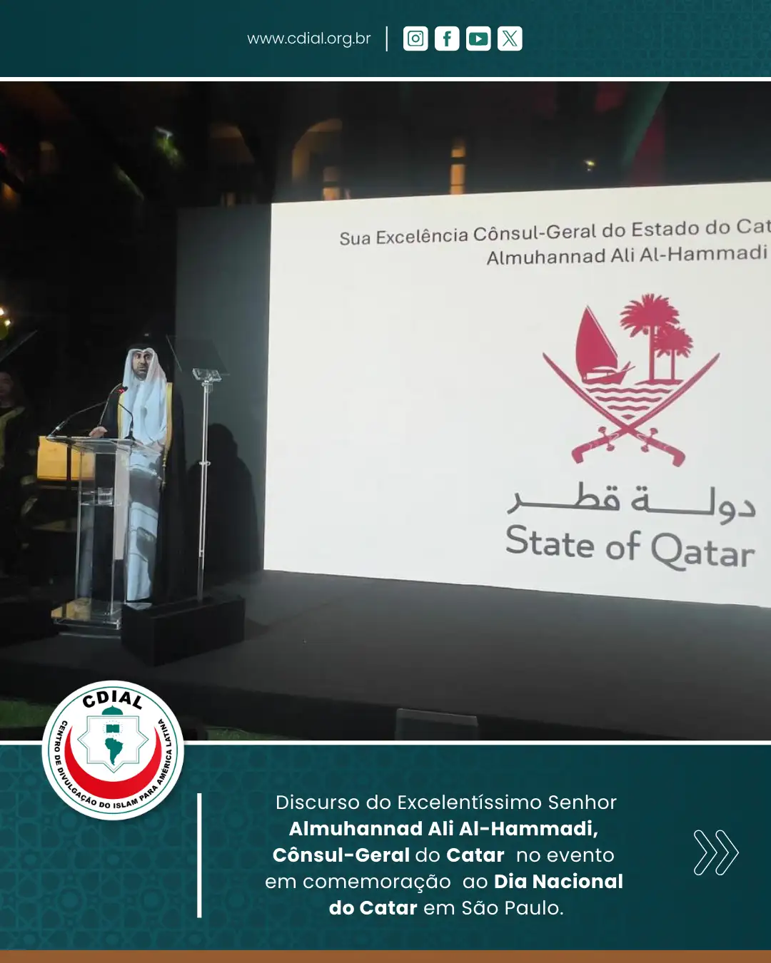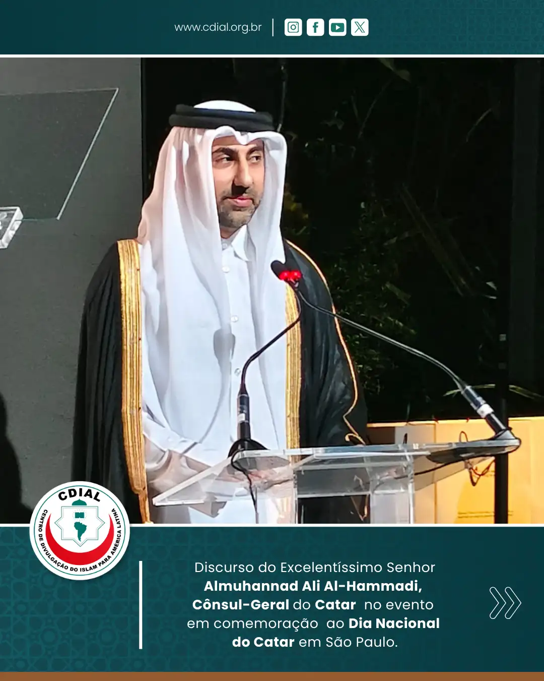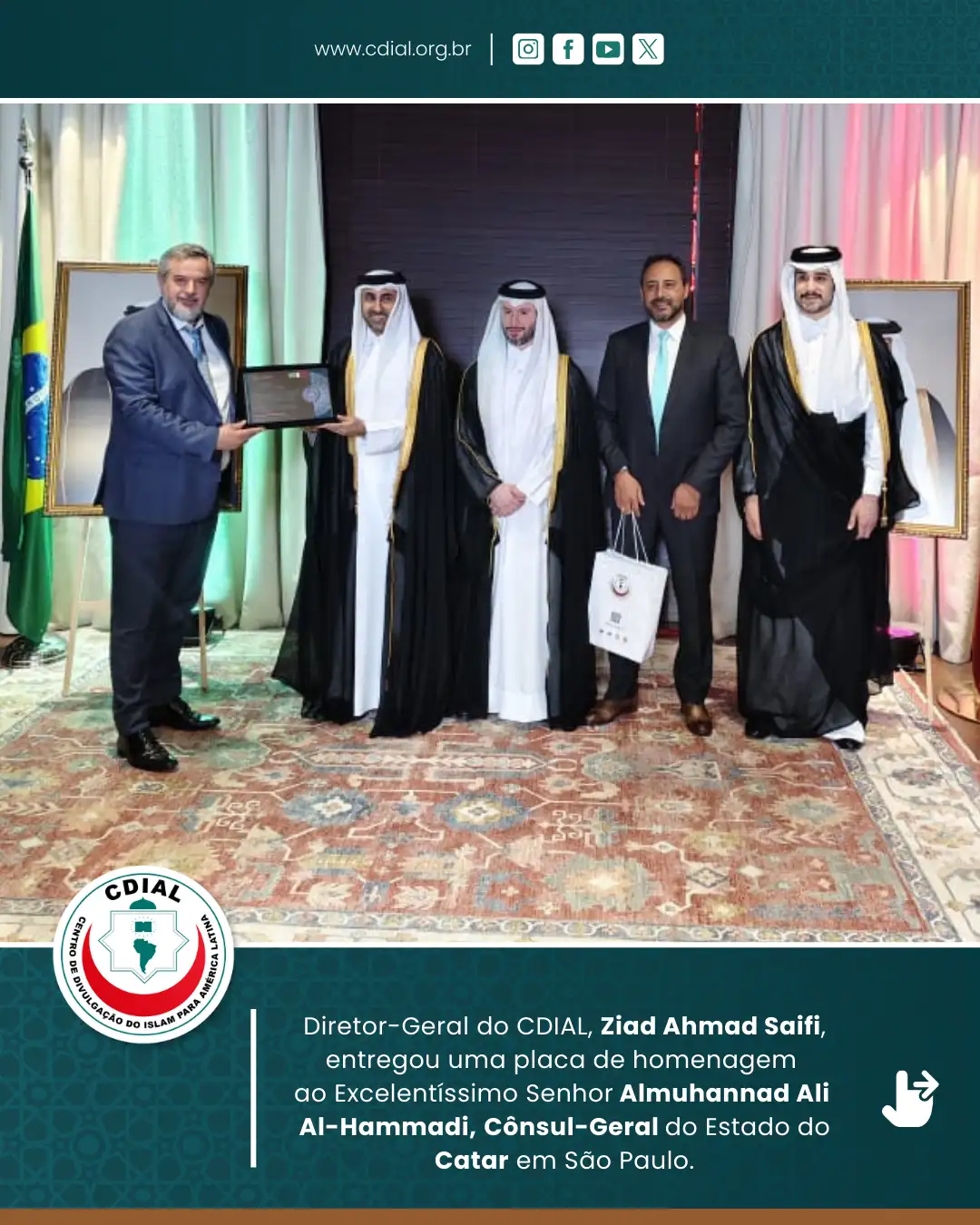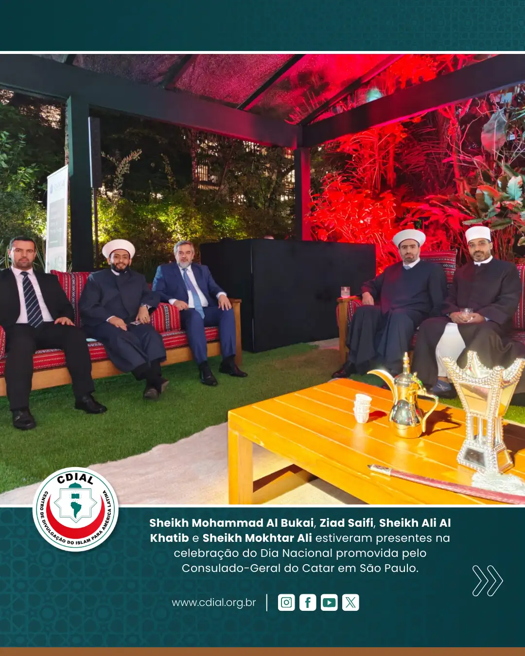 O evento contou com a presença de autoridades diplomáticas, representantes institucionais, lideranças civis e convidados, reforçando os laços de amizade e cooperação entre o Catar e o Brasil. Entre os presentes esteve o Diretor-Geral do Centro de Divulgação do Islam para América Latina (CDIAL), Ziad Ahmad Saifi, que participou da solenidade em nome da instituição.